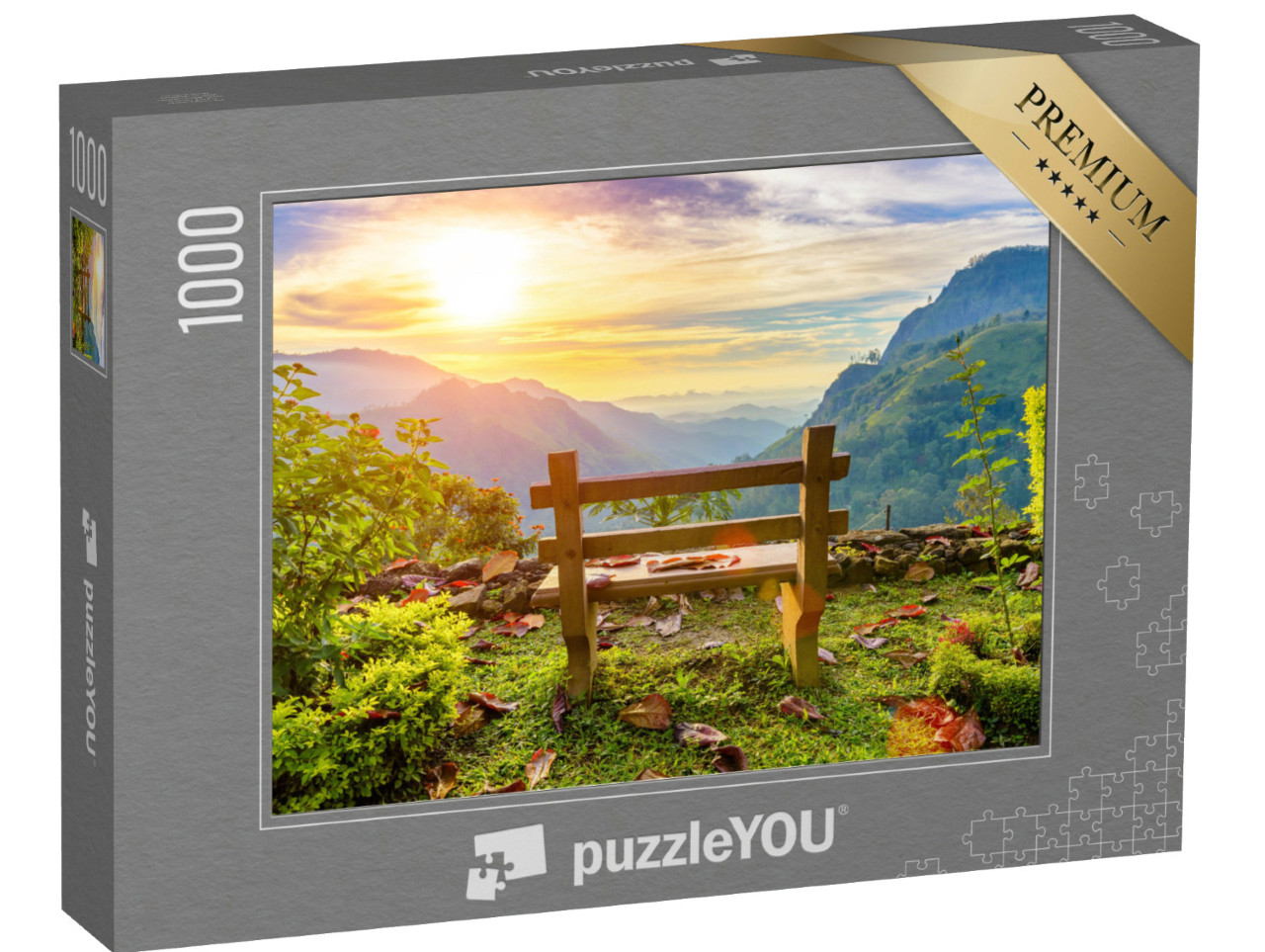 Puzzel „Een bankje met uitzicht op de prachtige bergvallei bij zonsopgang, Ella, Sri Lanka“