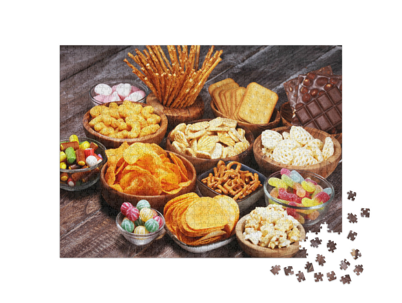 Puzzel „Klaar voor de feestavond: kleurrijke selectie snacks“