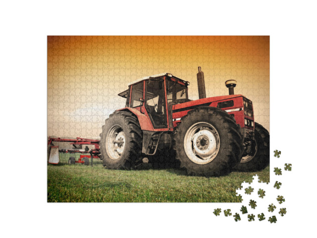 Puzzel „Oude rode tractor op de weide tijdens maaiwerkzaamheden“