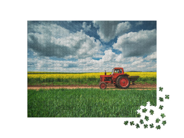 Puzzel „Rode tractor met aanhanger voor een koolzaadveld, Oxfordshire“
