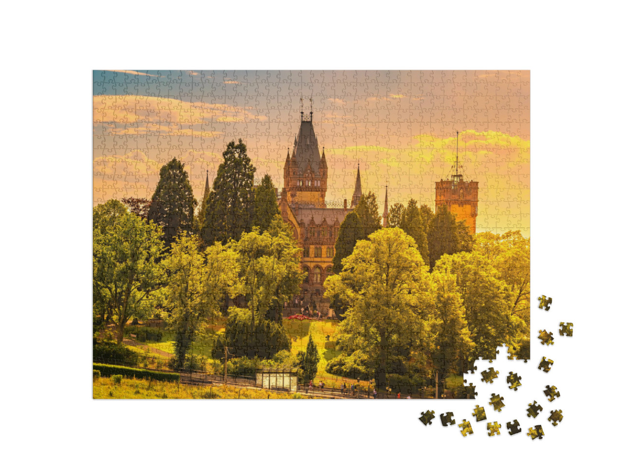 Puzzel „Schilderachtige zonsondergang bij kasteel Drachenburg, Königswinter aan de Rijn“