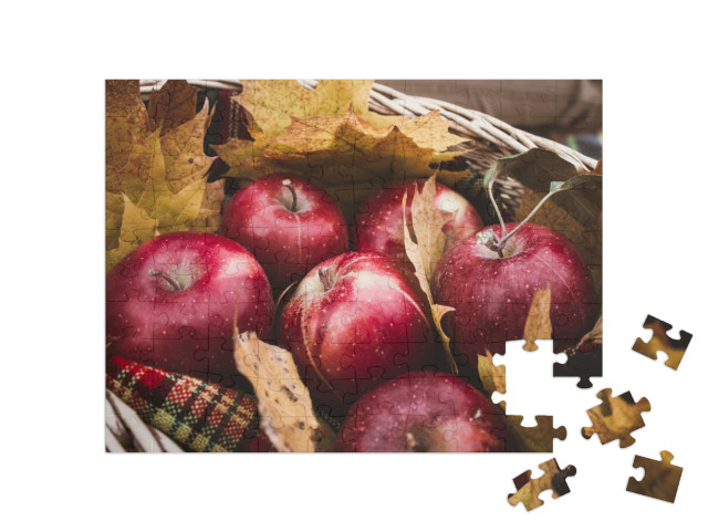 Puzzel „Rode appels oogsten in een mand vol herfstbladeren“