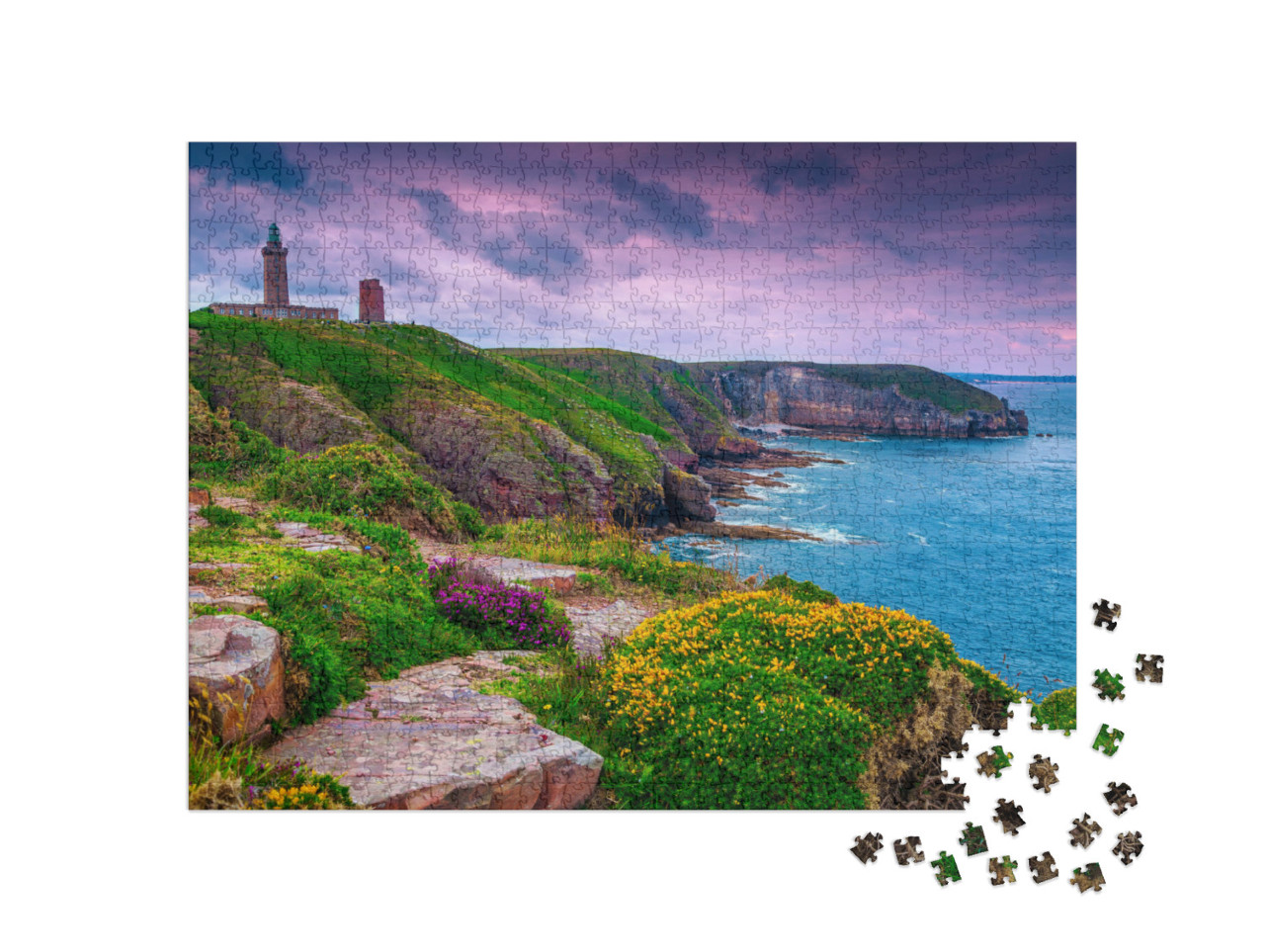 Puzzel „De vuurtoren van Cap Frehel op de rotsachtige kustlijn van Bretagne, Frankrijk,“