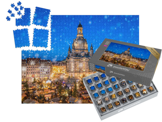 Puzzel „Kerstmarkt voor de Frauenkirche van Dresden op de Neumarkt, Saksen“